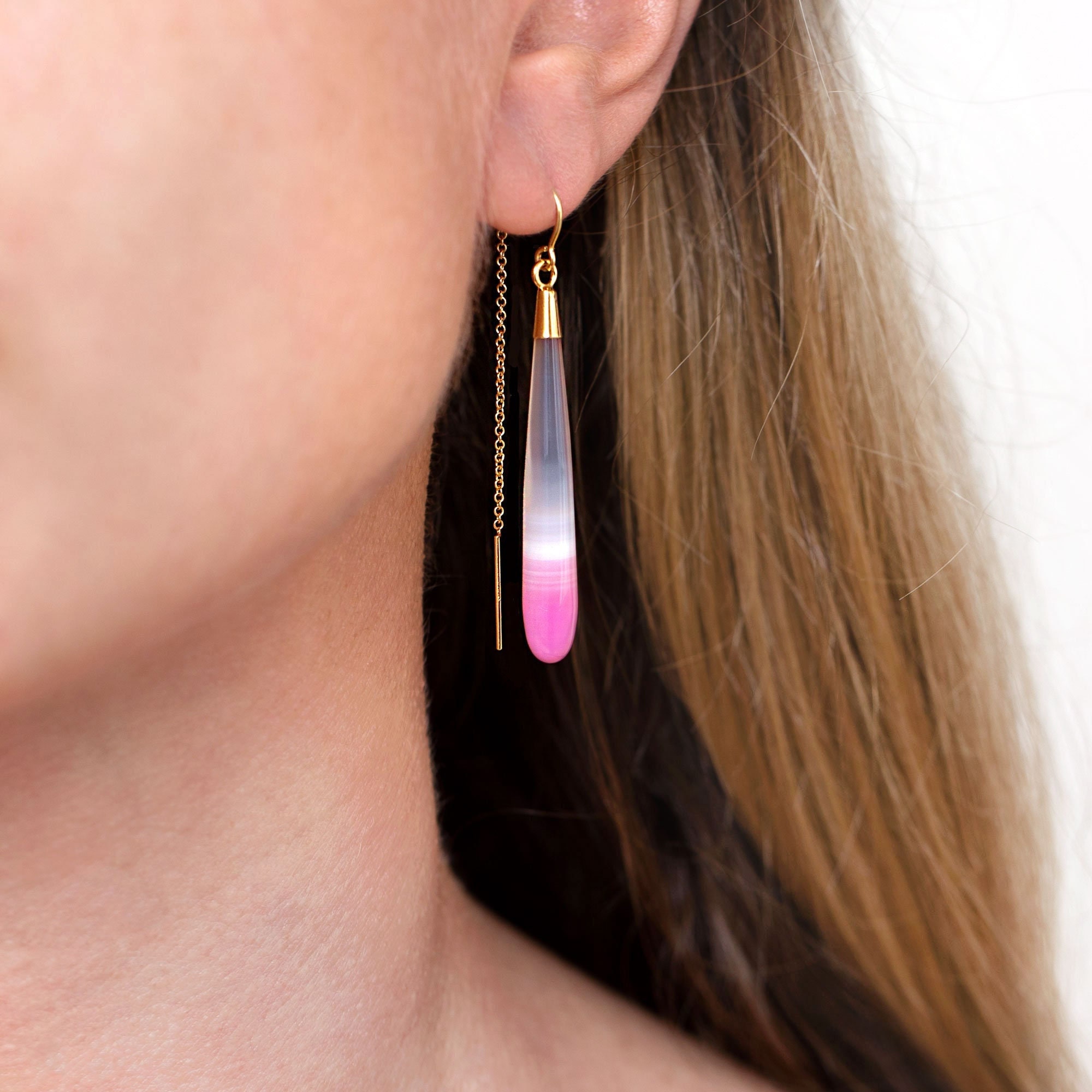 ✨ These statement threader earrings feature a large Fuchsia Pink or Blue Chalcedony gemstone drop attached to a 14k Gold Filled threader. These unique, eye-catching earrings are lightweight, making them perfect for everyday wear ✨