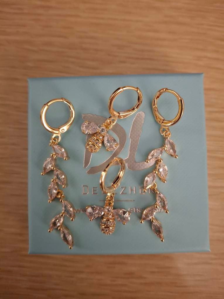 Dainty Diamond Drop Earrings, Bridal Diamond Earrings, Gold Huggie Hoop Earrings, matron of honor gift, bride earrings, dangling earrings