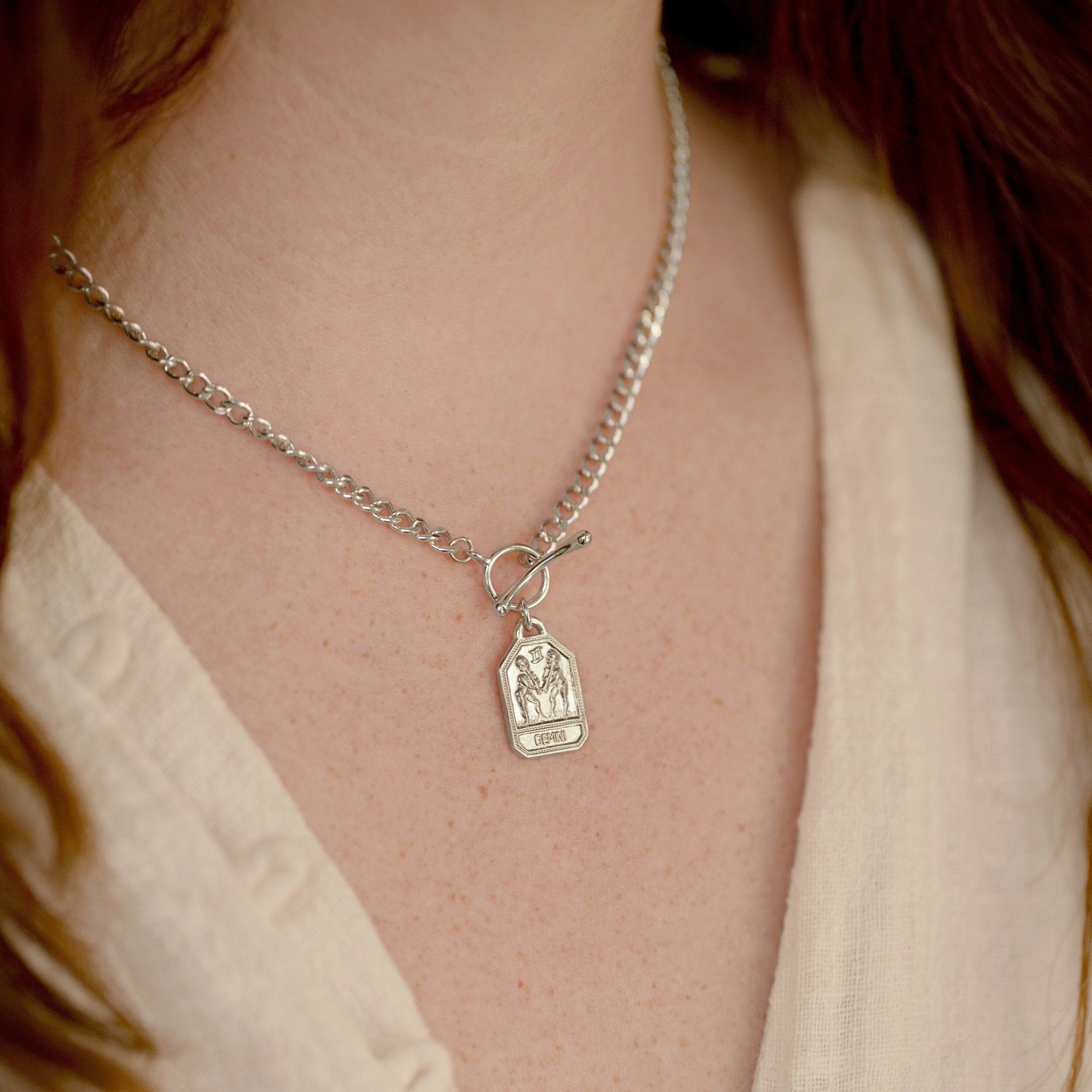 Zodiac Charm Toggle Necklace Silver, Gemini Cancer Taurus Scorpio Astrology Gift, Thick Silver Curb Chain Layering Choker, T Bar Large Clasp
