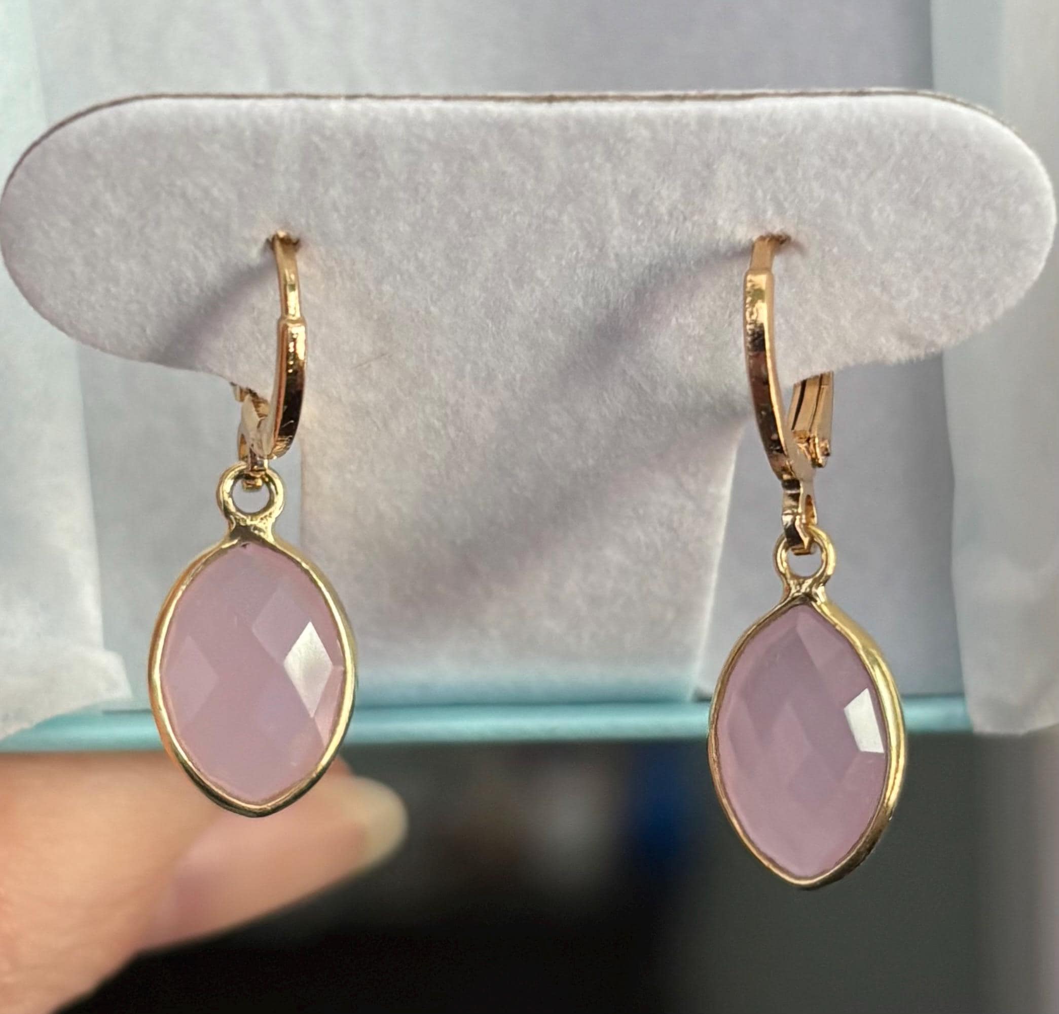 Shockingly quick shipping. Bought these simple huggie earrings as a gift in pink chalcedony. The clasp is very sturdy, and the stone's color is exactly the same pink shown online. When not against a white background (like in the listing), it shows as a slightly softer pink, which is just what we wanted.