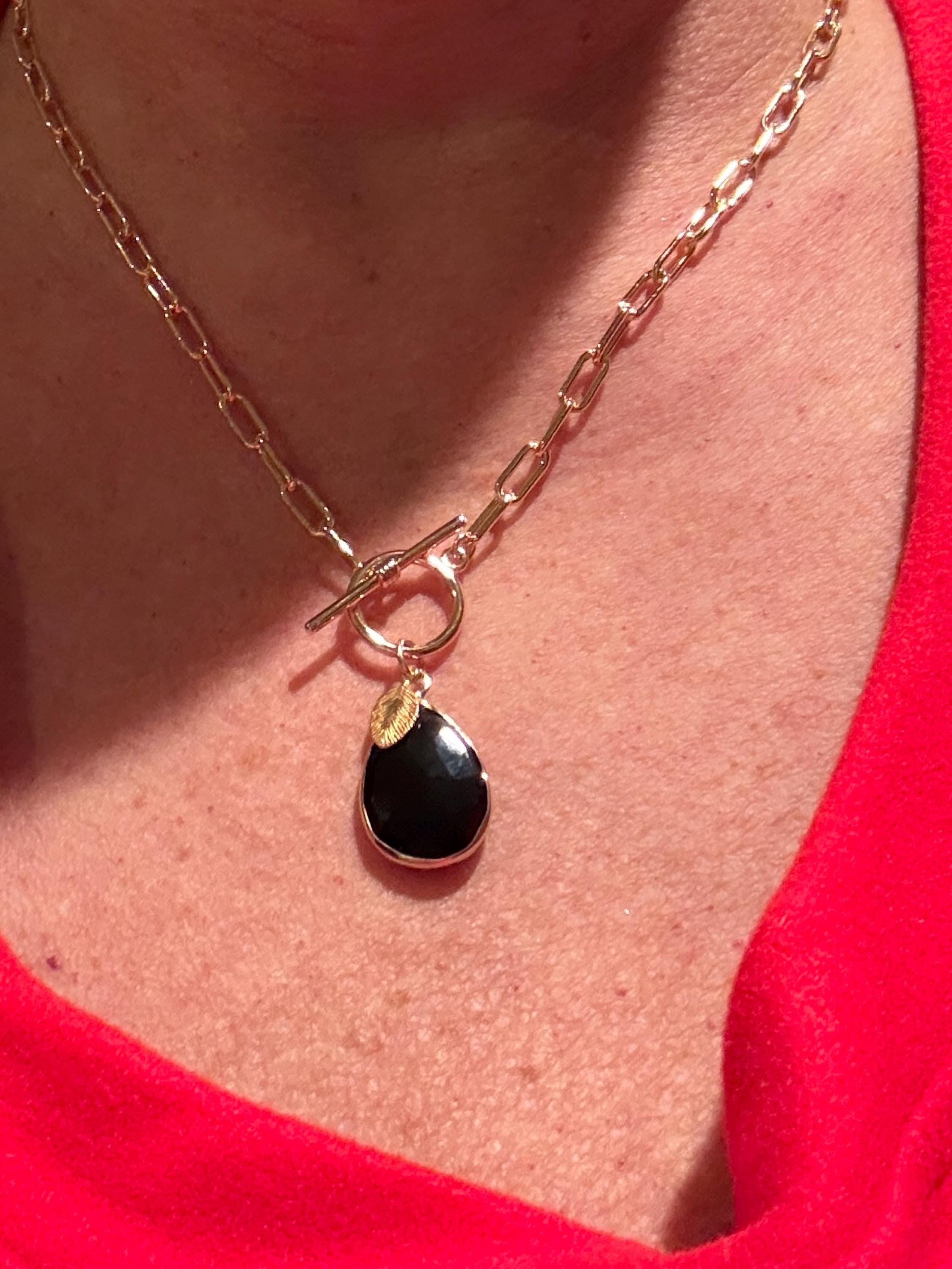 ✨ This necklace features a bezeled gemstone pendant attached to a chunky paperclip toggle chain. Personalize the necklace further by adding dainty leaf charms that feature hand-stamped initials. This necklace is available in both Gold and Silver finish and in 17 different gemstone options!