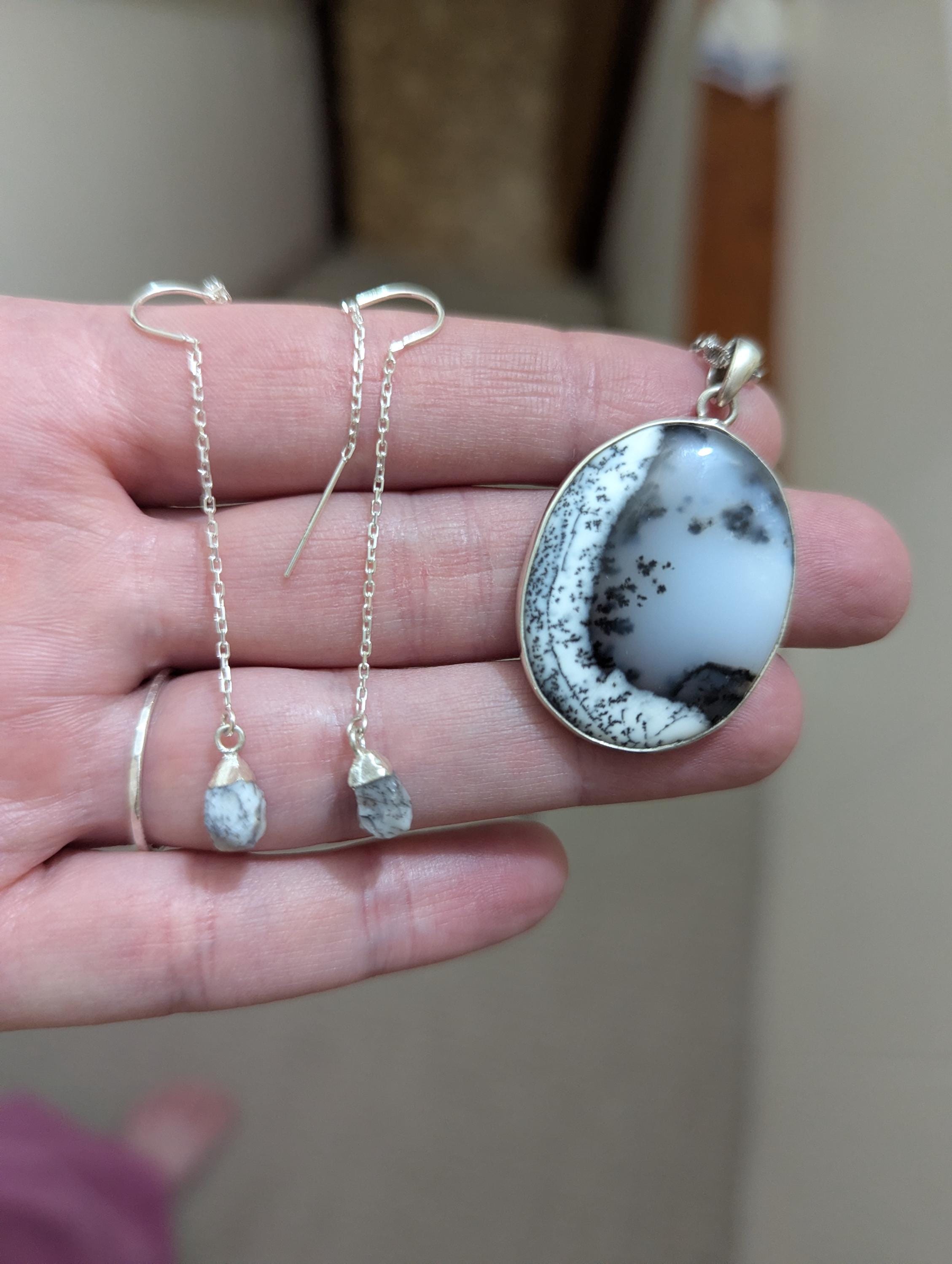 Raw Stone Threaders, Marble Stone Earrings, Minimalist Gift, Natural Dendrite Opal, Black and White Stone Drop Earrings, Howlite Jewelry