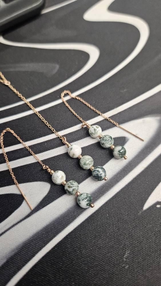 Genuine Gemstone Earrings, Dainty Tree Agate Moss Threaders, 14k Rose Gold Filled, Jewelry Gift, Dark Green Natural Stone, Boho Gift