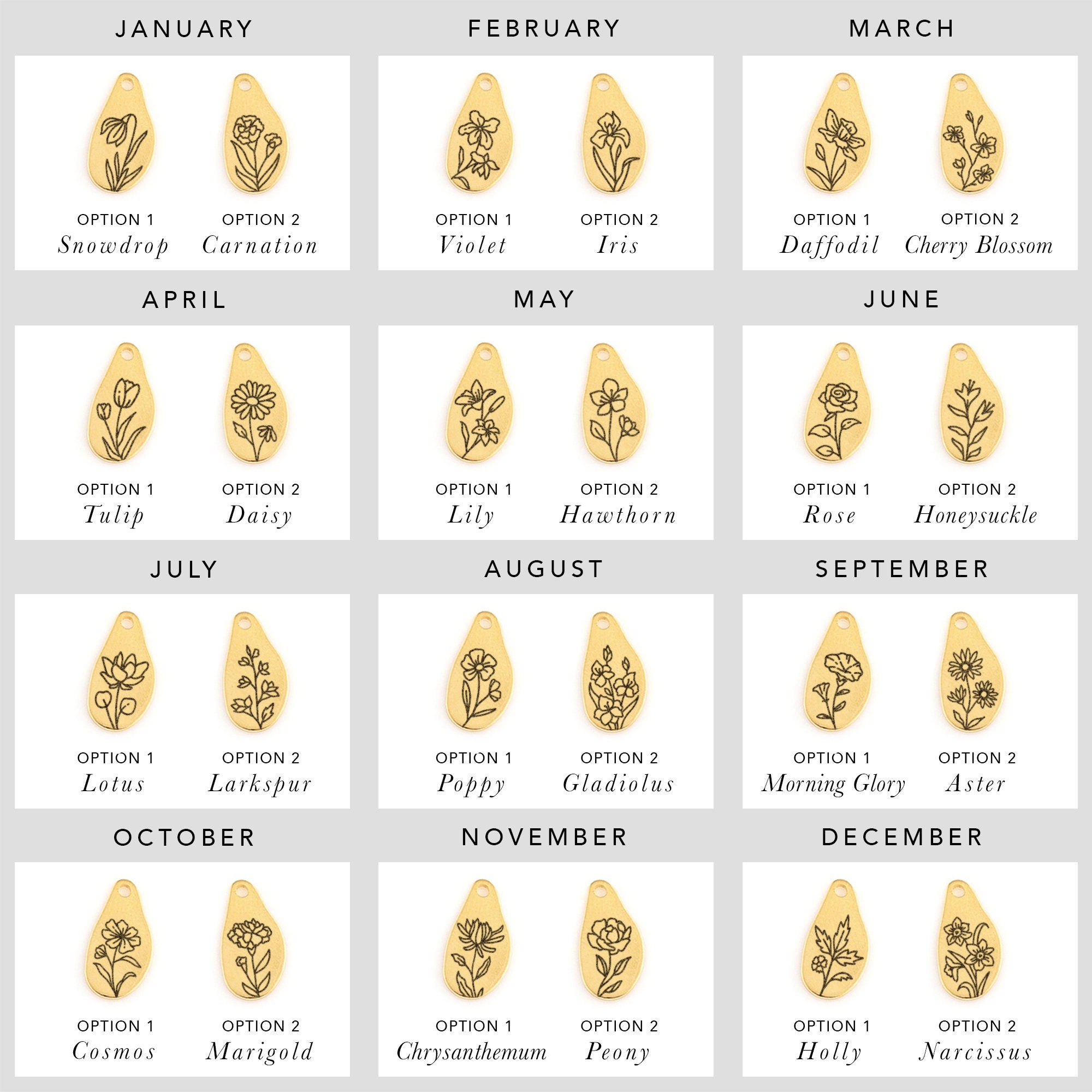Each flower representing a birth month is individually engraved onto a dainty petal charm. Create a bouquet of 1-12 flower petals and reach out to request additional charms. Necklaces are available in Gold, Silver & Rose finish.
